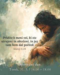 V torek, 31. 3., bo za vse, ki bi se še želeli spovedati, priložnost za sveto spoved od 16.00 do 18.00 v mariborski stolnici. Na voljo bo tudi tuji spovednik.